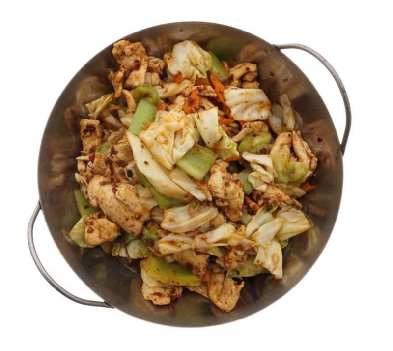 Пилешко, зелка, морков, пиперка, црни кинески печурки, лут слатко-кисел сос